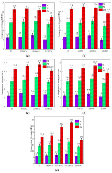 Compressive strength of cement-fly ash mortar containing the RBP or RCP. (a) mortar with RBP; (b) mortar with RCP; (c) mortar with HRP-I; (d) mortar with HRP-II; (e) HRP-I-replacement fly ash.