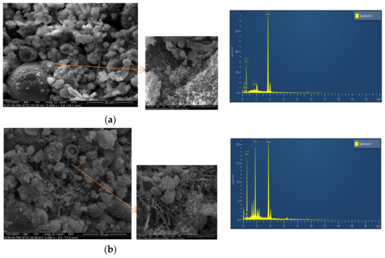 Figure 8a shows that white flocculent substances were attached to the surfaces of the fly ash spherical particles in the cement-fly ash mortar. This material is a hydraulic cementitious material, such as C-S-H and C-A-H, and it is formed by reactions between SiO2 and Al2O3 in the fly ash with the cement hydration product Ca(OH)2, which is consistent with the conclusions of Du [63], Hardjito [8], and Narmluk [64]. Needle-like substances appeared between the spherical particles of the fly ash, and these comprised ettringite (AFt) formed by the reaction of Al2O3 and Ca(OH)2 in fly ash. A comparison of Figure 8a,b showed that there were holes in the internal micromorphologies of the cement-fly ash mortar made with HRP and the cement-fly ash mortar made without HRP. However, the cement-fly ash mortar containing HRP was forming a relatively stable dense structure, which showed that HRP filled the microaggregates. In addition, the CaO in the RCP reacted with water to generate the alkali activator Ca(OH)2, which promoted a secondary hydration reaction between the active component of the RBP and the cement hydration product. The combined effects of RBP and RCP increased the hydration products formed in the mortar with HRP, and the thicknesses of white flocculated substances attached around the fly ash particles in Figure 8b was larger than for those in Figure 8a. Moreover, the presence of numerous fibrous crystals was observed to be distributed among the hydration products, such as C-S-H gel, as depicted in Figure 8b. These fibrous crystals effectively enhanced the densification and compactness of the cement paste. The cumulative effects of HRP-I resulted in the enhanced strength of the cement-fly ash mortar. Figure 8c displays the elemental map of the cement-fly ash mortar and the cement-fly ash mortar with HRP. It is evident that the calcium content decreases while the silicon content increases with an increase in the HRP replacement ratio. This trend can be attributed to the lower calcium and higher silicon content present in HRP compared to cement.
