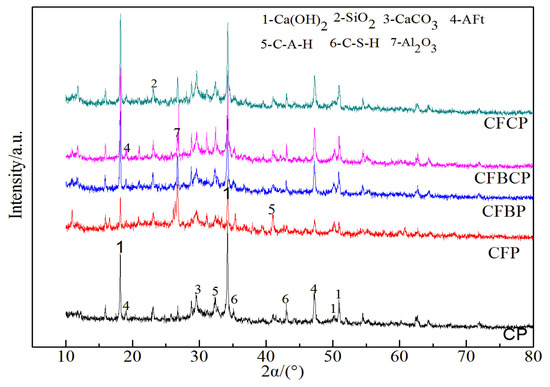 Figure 9 shows that the main hydration products formed at 28 d in the different cement pastes were calcite (CaCO3), ettringite (AFt), calcium hydroxide (CH), SiO2, C-S-H, and C-A-H. SiO2 came from the fly ash, CaCO3 came from the HRP, and calcium hydroxide (CH) was derived from the cement hydration products. The hydration process was similar to that described in the literature [54,60] and mainly Aft, C-S-H gel, and C-A-H gel were formed, which strengthened the cement-fly ash mortar with HRP. Compared with the CH diffraction peak intensity for the CP, the CH diffraction peak for CFBP had the lowest intensity and the largest width, indicating that CFBP had the lowest pozzolanic activity. Compared with CFP, the diffraction peak intensities for SiO2 and Al2O3 in the CFBCP were reduced because of the reactions occurring between the SiO2 and Al2O3 in the HRP with the cement hydration product CH to form the C-S-H gel and C-A-H gel. Figure 8 shows that CH had formed layered or flaky hexagonal crystals, and the arrangement affected the compressive strength of the cement mortar [33,34,60]. Therefore, the characteristic diffraction peak intensity was used to calculate the orientation index R for the calcium hydroxide (CH). When the R value was larger, the orientation of the CH was more substantial, and the compressive strength was lower. In this paper, the CH crystal plane with a diffraction angle of 18.1° (001) was selected as the reference plane, and the crystal plane orientation index R with a diffraction angle of 34.0° (101) was: