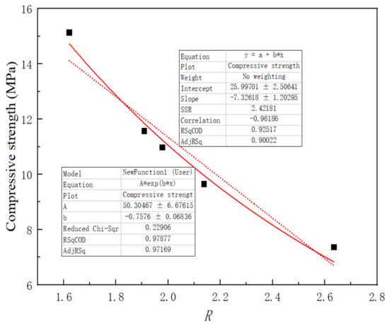 Table 3 shows that the R value of the cement paste was the smallest, and the R values of all cement paste samples containing fly ash were greater than 1.622. According to the laboratory test results, the maximum compressive strength of the cement paste after 28 days was 15.12 MPa, which was greater than the strengths of the cement-fly ash paste and the cement-fly ash paste with HRP. The corresponding compressive strength decreased after using fly ash or HRP to replace some of the cement. To determine the relationship between R and the compressive strength, a linear plot and an exponential fitting function were used to perform a regression analysis on the data, and the results are shown in Figure 10. Figure 10 shows that the correlation coefficient R2 was 0.979 when an exponential function was used to fit a plot of the orientation index R versus the compressive strength of the mortar. With a linear function, the correlation coefficient R2 was 0.925. This observation signifies that the compressive strength of the paste is influenced by a multitude of factors. The orientation index R served as an indicator to gauge the impact of HRP on the compressive strength within the cement-fly ash system. In addition, in the presence of fly ash, the R values of the HRP pastes were lower than the R values for the RBP or the RCP, and the R value for RBP was greater than that for RCP. This occurred because the SiO2 in the RBP and fly ash accelerated the hydration processes in the early stages of cement hydration, which resulted in decreased intensities for some of the diffraction peaks. This was consistent with the change law for the CH diffraction peak eigenvalues at diffraction angles of 18.1° (001) and 34.0° (101). Therefore, the orientation index R indicated the effect of the HRP on the compressive strength of the cement-fly ash system. The orientation index R of CH can be used to reveal the strength evolution law for the HRP-cement-fly ash system.