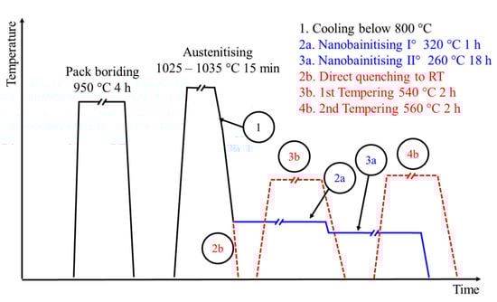 Scheme of hybrid heat treatments: boriding with nanobainitising and boriding with quenching and tempering.