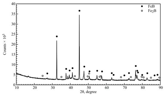 The microstructure of the layer produced on EN X37CrMoV5-1 steel by boriding at temp. 950 °C for 4 h (Br variant) is shown in Figure 3. The XRD analysis indicates the presence of two types of iron borides on the borided surface: FeB and Fe2B (Figure 4). The signal from the FeB phase is intensive, while the signal from the Fe2B phase is relatively weak. It should be mentioned that the high chromium content in steel could lead to the incorporation of this element in FeB- or Fe2B-type borides or the development of a small amount of chromium borides. Some studies have reported that during the boriding of steel, the Fe2B phase is formed first, and the FeB phase is formed by the accumulation of boron atoms in the layer (the diffusion of boron through Fe2B is strongly hindered) []. Hence, an increasing amount of Fe2B with increasing depth below the surface can be expected. In this work, the thickness of the borided layer (measured to the tips of the borided teeth) was 42.6 ± 8.3 µm. As can be seen in Figure 3, the borided layer exhibits saw-tooth morphology and is not physically homogenous. The borided layer consists of two boride types: FeB and Fe2B. The weak contrast between the FeB borides (dark pink) and Fe2B (light pink) indicates the upper zone of the FeB borides, up to a depth of 32.8 ± 7.2 µm.