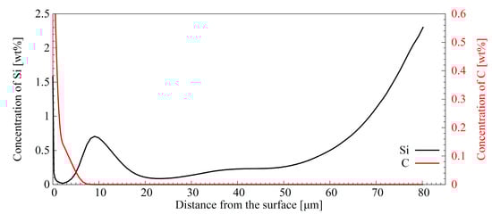 Figure 5 shows the GDOES profiles of silicon and carbon in the borided layer (Br variant). The concentration of carbon in the borided layer is close to zero. Additionally, a substantial redistribution of silicon atoms can be seen towards the layers. In the investigated steel, the amount of silicon is 1.16 wt%. (Table 1). The contribution of this element in the borided layer is in the range of ca. 0.1–0.7 wt%. Below a depth of 50 µm, the amount of silicon increases continuously, reaching a level of 2.3 wt%—twice of that in steel (Table 1). A higher contribution of silicon is associated with the presence of silicon-rich ferrite in this area (Figure 3).