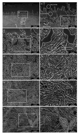 In the borided layer closest to the surface, the porous zone forms (Figure 3a,c,d) and falls to a depth of 11.1 ± 2.2 µm. The near-surface porosity of borided steel is a well-known phenomenon reported by other researchers [,,]. Porosity is commonly explained by the Kirkendall effect [,]. Below this zone, the borided layer is compact, although small objects with irregular shapes can be observed. These are fragments of silicon-rich ferrite areas intersected by the cross section or cavities after silicon-rich ferrite is chipped out. Silicon-rich ferrite is clearly visible between the layer of borides and the substrate, and its areas separate boride teeth. This phase is a typical component of borided steel layers containing more than 0.8 wt% silicon [,]. The interface between the layer and the substrate is relatively smooth. The substrate has many white, mostly globular precipitates just below the layer in the transition zone. The works of other researchers indicate that these are precipitates of borocarbides [,]. The amount of these precipitates decreases with the distance from the layer–substrate interface. The transition zone under the silicon-rich ferrite sublayer is not clearly visible (Figure 3c). However, more strongly etched areas and precipitates can be seen there (Figure 3c). The difference in etching indicates a different chemical composition of this area compared to the core. The microstructure of the core is dominated by martensite, formed from cooled austenite (Figure 3b). The local presence of bainite from continuous cooling is also possible.