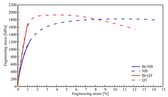 The limit of engineering strain is similar for the Br-NB and Br-QT variants (Figure 11), indicating that the factor regulating the resistance of the material was the condition of the produced borided layer. After boriding and nanobainitising (Br-NB variant), steel reached a rupture strength (RS) of 1233 MPa, a YS of 842 MPa, and a total elongation of 0.74%. Borided steel after quenching and tempering (Br-QT variant) reached an RS of 1573 MPa, a YS of 1435 MPa, and a total elongation of 0.41%. It is worth noting that in the case of hybrid treatments, the yield strength reached slightly lower values than in the case of corresponding treatments without boriding. This may be a consequence of the influence of the heat cycle of boriding on the microstructure of steel before subsequent heat treatments and, thus, on the phase transformations occurring during them.