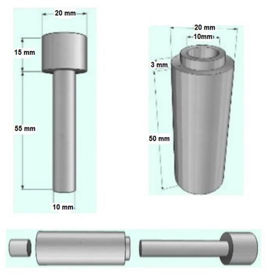 The powders of i, Nb, and Zr were mixed in a ball milling container, running at 24 rpm for 10 h to ensure compositional homogeneity. Each alloy was separately mixed with the addition of 20% (wt.) SH agent (NH4HCO3) to generate higher porosities. All powder mixtures were then uniaxially compacted under 300 MPa, in a tool-steel die with dimensions of Φ10 × 15 mm at ambient temperature. The constructive shape of the steel die tool used is given in Figure 1. Whereas the alloy samples with SH were heated to 180 °C and held for 2 h to remove SH from the bulk. Then, all alloy samples were sintered at 1200 °C for 6 h in an argon atmosphere, before being cooled down to 200 °C at a rate of approximately 5 °C/min. Consequently, the graph of the sintering regimes for the sample alloys with low and high porosities is given in Figure 2.
