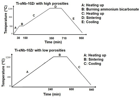 The sintering regimes for Ti-xNb-10Zr with low and high porosities.