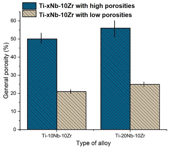 However, the mechanical properties of all sintered alloys achieved might be linked not only with porosity level but also with phase constituents (β/α phases). Accordingly, increasing Nb concentration from 10 (at. %) to 20 (at. %) decreased the mechanical performances, as Nb acted as β phase stabilizer. Previous studies stated that the mechanical properties of this type of Ti-phase were lower than those of the α phase. According to this concept, Ti-20Nb-10Zr alloy with low porosity exhibited higher β phase formation compared to Ti-10Nb-10Zr alloy with low porosity, resulting in lower UCS and yield strength values. Similarly, the same was observed in the alloys with high porosities. However, noted that adding a space holder agent did play a more critical role in the reduced mechanical performances of the sintered alloys comparing the α/β phase ratio.