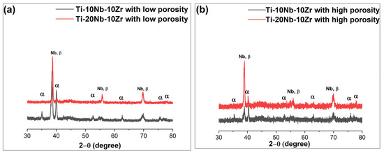 X-ray diffraction spectra for (a) Ti-xNb-10Zr (x: 10 and 20; at. %) with low porosities; (b) Ti-xNb-10Zr (x: 10 and 20; at. %) with high porosities.