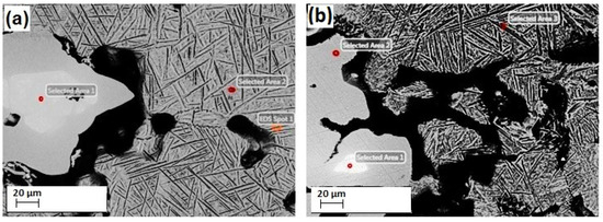 EDS analysis showing SEM micrographs and individual EDS points for Ti-10Nb-10Zr and Ti-20Nb-10Zr alloys with low porosities is depicted in Figure 5. The atomic compositions for individual EDS points are listed in Table 2. Different Ti, Nb, and Zr concentrations were detected across the examined areas of the alloys. The dark gray areas corresponding to the α phase were rich in Ti and Zr; white-gray areas corresponding to the β phase were rich in Nb; bright white areas corresponded to the primary Nb phase, although there were no undissolved Zr particles in the alloys studied. This was expected as Zr is fully dissolvable in the Ti matrix, but Nb has limited solubility in the α phase [29]. Therefore, in-homogeneous microstructures were obtained in all alloys due to the insufficient sintering temperature selected in this study.