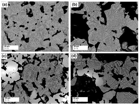 SEM micrographs for all-sintered alloys with low and high porosities are shown in Figure 6. SEM micrographs showed that irregularly shaped pores with sharp corners were observed in the microstructures. The closed pore structures were determined in the alloys with low porosities, whilst open pore (interconnected) structures were found in alloys with high porosities, allowing for cell ingrowth and body liquid. SEM micrographs of the sintered alloys showing the pore morphology and distribution were evaluated to estimate the average pore size. In this regard, average pore sizes of the sintered alloys increased from 67 μm to 117 μm for Ti-10Nb-10Zr and 82 μm to 143 μm for Ti-20Nb-10Zr, as a consequence of the solid-state sintering. Accordingly, mean pore sizes and distributions for the alloys with high porosities were much higher than those for the alloys with low porosities, which revealed that the characteristics of pores achieved were consistent with the porosity level of the alloys. Two different types of pores were observed in the alloys achieved; these are macro and micropores. Micropores found in the alloys with low porosity were formed as a result of the sintering procedure, while the macropore observed in the alloys with high porosity was achieved as a result of the removal of space holders.
