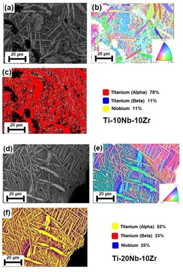 EBSD data showing the microstructure (IQ map), grain morphology (IPF map), and phase constituents and distribution (Phase map) for both Ti-10Nb-10Zr alloy and Ti-20Nb-10Zr alloy: (a,d) IQ map; (b,e) IPF map; (c,f) Phase map.