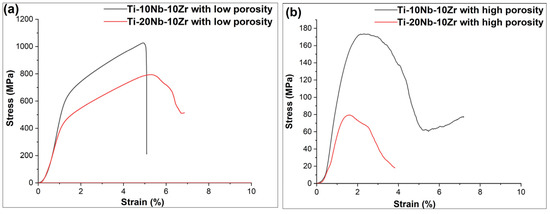 The Stress-strain curves for Ti-xNb-10Zr (x: 10 and 20; at. %) (a) alloys with low porosities, (b) alloys with high porosities.