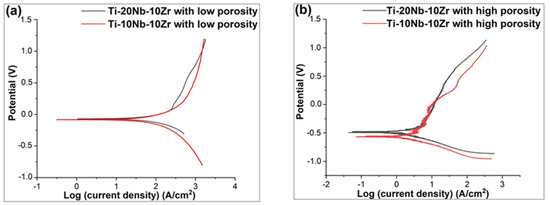 Results of electrochemical corrosion tests for Ti-xNb-10Zr (x: 10 and 20; at. %). (a) Alloys with low porosities; (b) Alloys with high porosities.