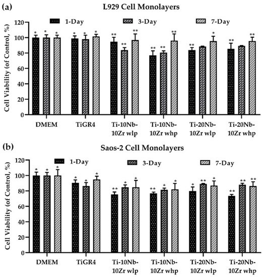 Cell viabilities upon exposure to the extracts of the examined alloys were found to be 77–97% for L929 and 72–80% for Saos-2 cell lines, which showed that alloys had significant differences in cell viability (p < 0.05). Here, the highest cell viability of L929 was determined in Ti-10Nb-10Zr alloy with 21% porosity as 97.02%, whereas the lowest one was observed in Ti-10Nb-10Zr alloy with 50% porosity, which was 76.96%. On the other hand, the maximum cell viability level for Saos-2 was found in Ti-20Nb-10Zr alloy with 25% porosity as 79.89%, whilst minimum one was observed in Ti-20Nb-10Zr alloy with 56% porosity, which was 72.48%. Results revealed that increasing Nb concentration from 10 (at. %) to 20 (at. %) in Ti-Zr mixtures resulted in a decrease in L929 cell viability and an improvement in Saos-2 cell viability. The treatment of Ti-10Nb-10Zr alloy with high porosity compared with low porosity one decreased the cell viability of the L929 cell line on the 1-day and 3-day but not on the 7-day application. This could be due to the adaptation of the cells to the conditions that occurred with high porosity samples and then the cell viability reached the same level, resulting in low porosity. The increase in Nb concentration from 10 (at. %) to 20 (at. %) in Ti-Zr alloys resulted in no significant change in L929 cell viability among the different periods of the treatments. The increase in Nb concentration from 10 (at. %) to 20 (at. %) in Ti-Zr alloys resulted in an increase in Saos-2 cell viability within the different periods of the treatments. It could be explained that the Saos-2 cell line might have a sensitive metabolic activity to the Nb metals, which may induce cell proliferation. In addition to these, Nb concentration might change the surface characteristics of the alloys by forming NbxO films.