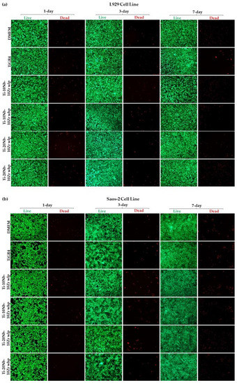 Cell Culture conditions: Mouse fibroblast NCTC clone 929 cell line (L929), and human bone osteosarcoma cell line (Saos-2) supplied by American Tissue Culture Collection (ATCC, Manassas, VA, USA) were used for in vitro characterization studies. L929 and Saos-2 were grown in DMEM supplemented with 10% Fetal Bovine Serum (FBS, heat-inactivated, Gibco, #10500-064), and 1% Antibiotic-Antimycotic solution (10,000 units/mL of penicillin, 10,000 µg/mL of streptomycin, and 25 µg/mL of Amphotericin B, Gibco, Waltham, MA, USA, #15240-062) in 37 °C, 5% CO2 incubator. Their medium was changed with fresh DMEM every 2 days, and they were harvested with Trypsin-EDTA solution, 0.25% (Gibco, #25200-056) when they reached 70–80% confluency.