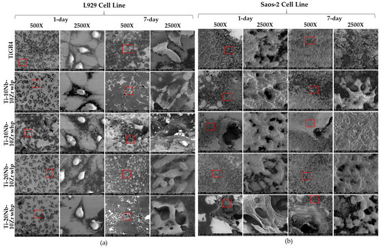 SEM images of viable (a) L929 and (b) Saos-2 cell lines for Ti-xNb-10Zr (x: 10 and 20; at. %) alloys with low porosity (wlp), with high porosity (whp), and the reference TiGR4 extracts for 1-day and 7-day. SEM images were taken with 500× magnification; 2500× magnification images taken from the red squares area in the 500× images.