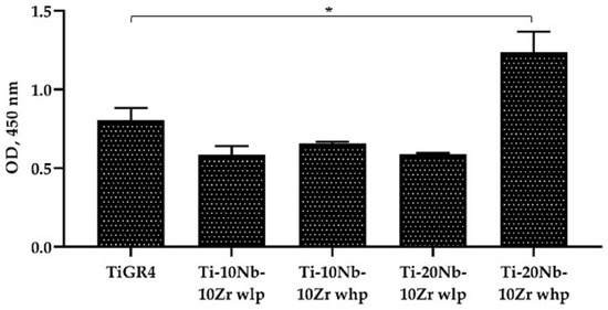 Adsorption of Fibronectin on Ti-xNb-10Zr (x: 10 and 20; at. %) with low porosity (wlp), with high porosity (whp), and the reference TiGR4 determined after 2 h incubation at 37 °C in a 5% CO2 atmosphere by ELISA method. Data represent mean ± SD, n = 3, * for p < 0.05.