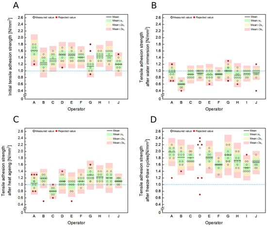 In the initial tensile adhesion strength case, the lowest mean value was 1.23 N/mm2 (operator J), and the highest was 1.58 N/mm2 (operator A). In the case of the determination of tensile adhesion strength after immersion in water, the results ranged from 0.58 N/mm2 (operator B) to 1.01 N/mm2 (operator G). Operator C obtained the lowest mean value of 0.80 N/mm2, and operator G got the highest mean value of 1.32 N/mm2 for tensile adhesion strength after heat aging. The last measurement—tensile adhesion strength after freeze–thaw cycles—was characterized by values ranging from 1.55 N/mm2 (operator I) to 1.98 N/mm2 (operator A). In the case of tensile adhesion strength after freeze–thaw cycles measurement, one of the operators—operator D, obtained results, of which as many as seven did not meet the condition specified in clause 9 of EN 1348:2007. For this reason, there was no further analysis.