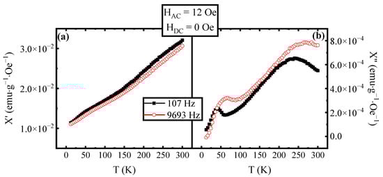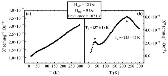 The evaluation of the real (χ′) and imaginary (χ″) components of AC magnetic susceptibility as a function of temperature is useful to investigate the presence of superparamagnetic transition in MNPs. In fact, as described in the literature [1], the peak in χ′(T) is associated with the TB of the MNPs with the largest dimension. On the other hand, the peak in the χ″(T) curve is associated with the mean value of the blocking temperatures of the MNPs [25]. In Figure 1, the χ′(T) and χ″(T) curves are reported as measured on our sample in the absence of a DC magnetic field. As it is possible to see the real component χ′(T) does not show the presence of a peak, indicating that the nanoparticles with the largest size transition to the superparamagnetic state at temperatures higher than 300 K. On the other hand, χ″(T) shows two peaks, the first at the temperature T1 = 37 ± 1 K and the second at the temperature T2 = 225 ± 1 K. As reported by Urian et al. [21], the presence of two peaks in χ″(T) can be explained in terms of a dipolar–dipolar interaction among the MNPs. To confirm the presence of interaction among nanoparticles, a measurement at different frequencies was performed. In Figure 2, the χ′(T) curves (Figure 2a) and the χ″(T) curves (Figure 2b) measured at the frequencies of 107 Hz and 9693 Hz of the AC field are plotted. As can be seen, the effect of an increasing frequency is the increase of both T1 and T2 as expected from the literature [1,25]. Using the value of the peaks’ temperatures in Figure 2b for both frequencies, it is possible to evaluate the Mydosh parameter [31] following the definition: