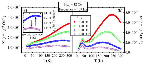 The intermediate region is associated with clustered magnetic nanoparticles. In our case, starting from the data in Figure 2, we have obtained Φ1~0.33 from T1 at 107 Hz, and at 9693 Hz, Φ2~0.073 from T2 at the same two frequencies. These results suggest that the peak at a lower temperature is associated with a non-interacting MNP behaviour, and the second is associated with a super-spin-glass behaviour. To strengthen these results, a study with different applied DC fields superimposed on the AC one was performed. In Figure 3, the χ′(T) curves (Figure 3a) and the χ″(T) curves (Figure 3b) at different values of the DC fields are reported. It can be noted that for DC applied fields ≥ 700 Oe, a peak appears in the χ′(T) curve (see inset in Figure 1a), confirming the superparamagnetic transition for the largest nanoparticles and consequently for the entire sample. The temperature shift of the peak is in agreement with the theory that predicts a decrease in the blocking temperature with the increase of a DC field applied to the MNPs [29].
