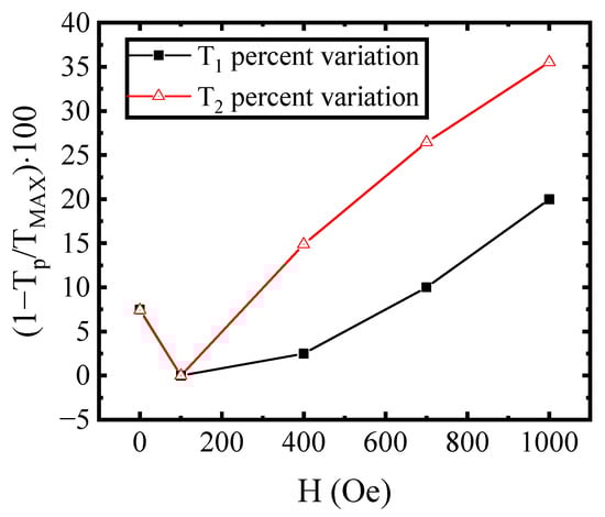 This can be better seen by plotting the percentage difference between the maximum value of T1 (equivalently T2), corresponding to the curve at the DC field of 100 Oe, and the other values of T1 (respectively T2) at different DC fields, as reported in Figure 4. It can be noted that, except for changing the DC field from 0 Oe to 100 Oe, the T2 percentage variation with a field is larger than the T1 one.