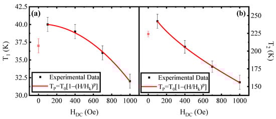 In this way, the fit is reduced to have two parameters, and the value of T0 can be derived from Equation (5) after the evaluation of Hk and p. This has been performed because, in our case, both T1 and T2 have an opposite (increasing) field behaviour in the range from 0 Oe to 100 Oe with respect to the higher fields’ region, as already mentioned. This has a consequence that the points at 0 Oe are not in agreement with the model described by Equation (5), and the parameter T0 cannot be initialised by T1 and T2 at HDC = 0 Oe. In Figure 5, the red line represents the result of the fitting procedure. In Table 1, the parameters obtained by the fit are reported for both the field dependences T1(HDC) and T2(HDC). The values obtained for the parameter p indicate that the behaviour of T1 (HDC) is well-described by Equation (2), whereas that of T2 (HDC) follows Equation (3).