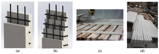 To produce coupon composite specimens, five 1500 mm × 1000 mm × 25 mm molds were created. First, basalt textile reinforcement was cut to the mold’s dimensions (Figure 2a). A spray gun was used to spray the first layer of glass fiber mortar into the mold (Figure 2b). The spraying thickness was checked at least at five different points (Figure 2c). The basalt textile reinforcement layer was placed into the mold and then covered with another layer of sprayed mortar. For specimens containing more than one basalt layer, the procedure was repeated until the final layer was reached and covered. The spraying process was performed continuously for the specimens without basalt textile reinforcement throughout the mold thickness. It should be noted that the thickness for all the composite configurations was 25 mm and basalt textile reinforcement layers were symmetrically placed throughout this thickness (Figure 3a,b). Panels were cured for seven days at laboratory conditions with the temperature of 21 ± 2 °C and 95 ± 5% relative humidity. Composite coupon samples were obtained by cutting the panels with the dimensions of 500 mm × 75 mm (Figure 3c,d). Hojdys and Krajewski [14] also obtained coupon samples of certain sizes from large panels. The coupon dimensions were selected considering the requirements of RILEM TC 232-TDT [42].
