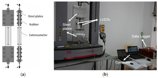 Specimens were clamped between two rigid steel plates at the top and the bottom and rubber plates with a thickness of 0.5 mm were placed between the steel plates and specimens. Specimens were connected to the testing machine via a hinged connection so that the rotation in the plane of the specimen was allowed. Figure 4a schematically illustrates the experimental setup.