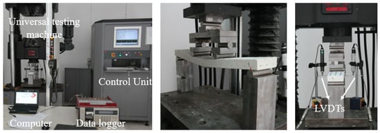 The flexural tests (four-point bending tests) were executed on the coupon specimens according to ASTM C 947 [45] using an MTS universal testing device. Load values were recorded with the help of the load cell of the device while displacement values were measured with two LVDTs and recorded in a computer environment using the TML TDS 302 data logger. The setup of the flexural test is given in Figure 5.