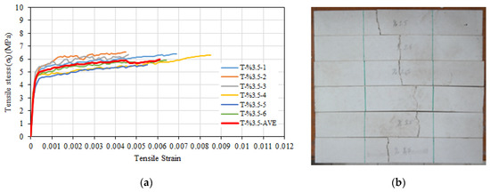 (a) Tensile stress–tensile strain relationships of T-%3.5 series. (b) Post-test view.