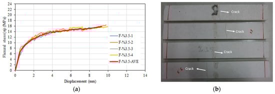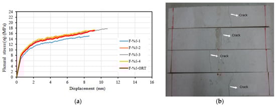 (a) Flexural stress–displacement relationships of F-%5 series. (b) Post-test view.