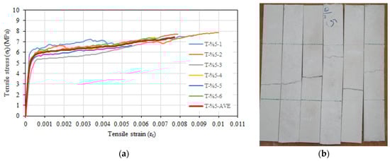 The tensile test results, standard deviation, and coefficient of variation values for the composite configuration with 5% glass fiber are given in Table 5. The average tensile strength of specimens was 7.42 MPa, while the average tensile strain value corresponding to the maximum tensile strength was 0.0077. The average value of the uncracked modulus of elasticity was calculated as 26,916 MPa. The cracked modulus of elasticity values for 5% were not calculated because no significant hardening was observed after cracking as was the case for the composite configuration with 3.5% of the glass fiber. The behavior and mode of failure observed during the experiment were similar to those described above for specimens with the ratio of 3.5% glass fiber. Figure 8a shows the tensile stress–tensile strain relationships of specimens, while Figure 8b depicts the post-test views.