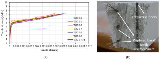 (a) Tensile stress–tensile strain relationships of T-BG-1 series. (b) View of failure surface.