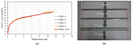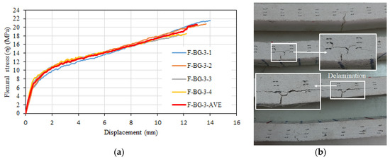 (a) Flexural stress–displacement relationships of F-BG-3 series. (b) Side view of the specimens after test.