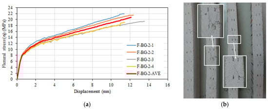 (a) Flexural stress–displacement relationships of F-BG-2 series. (b) Side view after test.