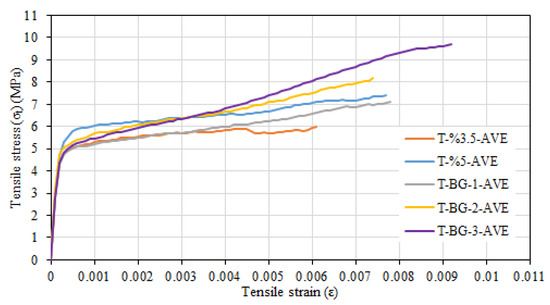 The mean stress, standard deviation, and coefficient of variation for composite specimens containing 3.5% glass fiber and two layers of basalt textile reinforcement are provided in Table 7. The average tensile strength of the specimens was determined as 8.16 MPa, while the average tensile strain value corresponding to the maximum tensile strength was determined as 0.0074. The average uncracked modulus of elasticity was calculated as 26,066 MPa and the average cracked modulus of elasticity was calculated as 501 MPa. Tensile stress and tensile strain relationships and view of specimens after the test are depicted in Figure 12. Damage progression was similar with composite specimens containing 3.5% glass fiber and one layer of basalt textile reinforcement.