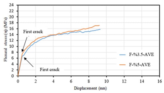 Average flexural stress–displacement curves for F-%3.5 and F-%5 series.