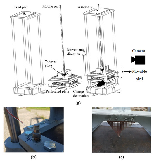 - Comb-type device located behind the upper plate as presented in Figure 1c. The device was employed to evaluate the displacement of the witness plate;