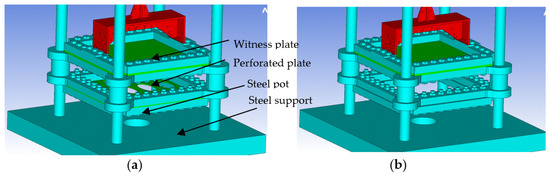 The proposed numerical approach has some limitations that are very likely to be present when considering the real design cases of the add-on mitigation systems. Thus, ground clearance and mass, as key parameters for vehicle mobility, especially in an off-road scenario, severely limit the distance that can be achieved between the explosive charge and the perforated plate, as well as the distance between the perforated plate and the witness plate. Thereby, the number of perforated plate layers that can be considered is also limited, even though, as pointed out in [26,27], the number of perforated plate layers can increase the attenuation factor (defined as the ratio of overpressure acting on the witness plate without and in the presence of the perforated plate). As a result, the analyses performed for a single perforated plate layer, with 90 mm clearance between the two plates and 92 mm between the explosive charge and the perforated plate, closely simulate a real IED (improvised explosive device) or mine attack scenario. Due to the close detonation range and the fact that the explosive charge was placed in a steel pot for both the experimental tests and the numerical simulations (simulating the metallic envelope and semiburied nature of an IED/mine), it can be safely stated that the study refers to a highly probable near-field blast scenario.