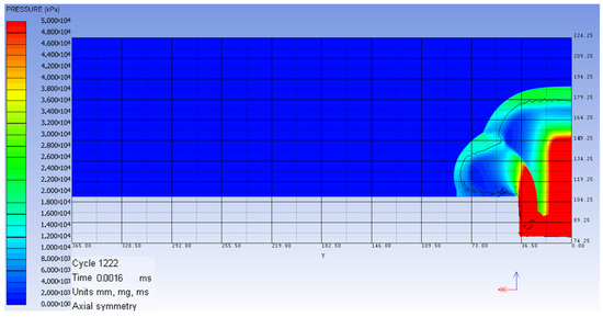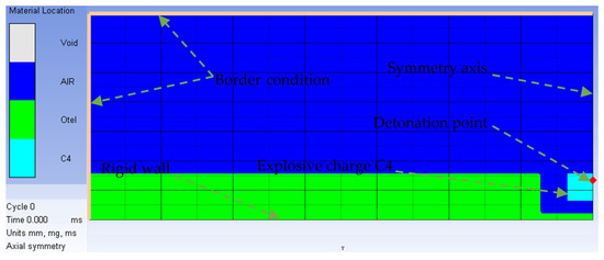 Since the accuracy of FEM numerical model results is mesh size dependent, using a 2D axial-symmetric model of 0.25 × 0.25 mm cell dimension ensures high precision of the results in a reasonable amount of time, which cannot be achieved in a 3D approach. The initial 2D model and the included boundary conditions are depicted in Figure 3. The imposed flow-out condition (as boundary condition) aims to simulate the transient nature of the phenomenon (the explosive products are able to escape from the model, so a perfect uniform pressure state cannot be achieved).