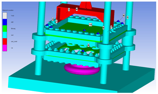 As mentioned in Section 1, in the present research, the shock wave attenuation ability of a perforated plate will be investigated for the near-field blast scenario. The main objective is to examine the shock wave front propagation and the transmission through the perforated plate to the witness plate. The defined numerical model is illustrated in Figure 2.