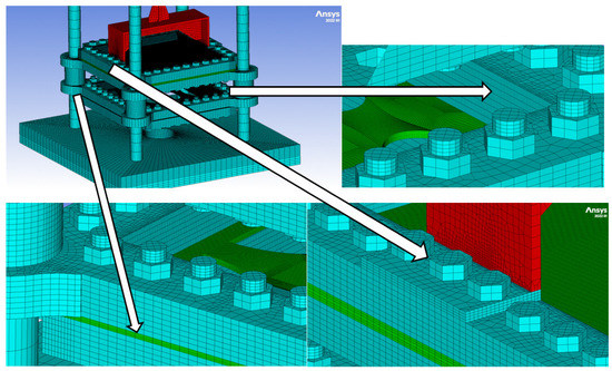 To solve the numerical simulation in parallel using the interaction type-external gap, the model was built using conformal nodes (nodes from different parts that are in contact must coincide). Unfortunately, this particular approach generates a very large number of elements (Figure 6). For the simulation, 8 hexahedral node elements were used, and since all the nodes in contact were considered coincident, bolt pretension was not taken into account.