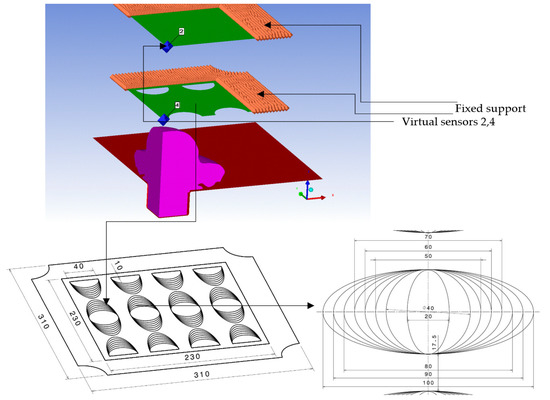 Figure 7 depicts the elliptic-shaped perforations of the perforated plate, ensuring an opening ratio variation between 10% and 50% (Table 2). In order to study only the influence of the perforated plate on the impulse transfer, the rigid connection between the two plates (the movable part) was removed and the two plates were fixed.