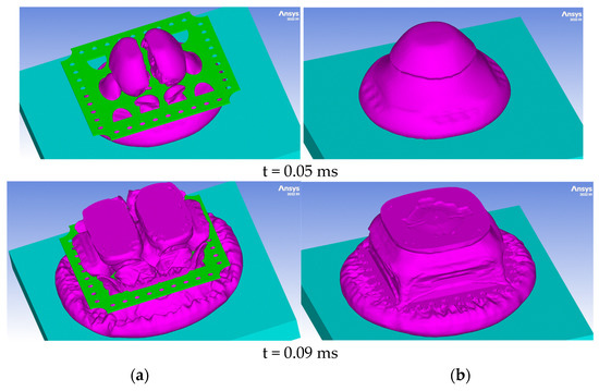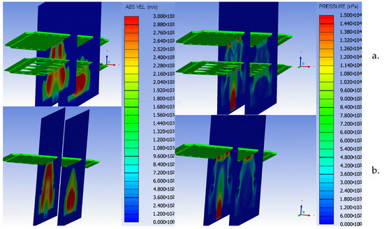 The pressure and velocity fringes (Figure 9) for the two simulated scenarios clearly exemplify the shock wave-breaking phenomenon in the presence of the perforated plate.