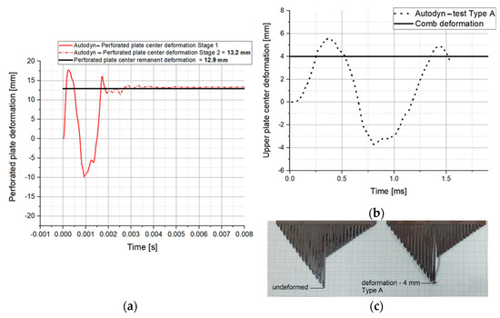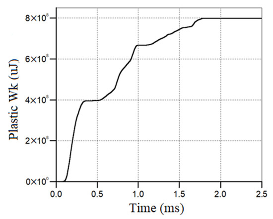 The calibration method involved two key parameters: the perforated plate deflection and the sled impulse, respectively. The first one ensures mainly the material model validity, while the second one is focused on the global phenomenon. As depicted in Figure 10, the numerical results and the experimental ones are in good agreement in terms of the residual deformation, but not so good in terms of the total deformation, where the numerical simulation overrates the parameter. Regarding the time moment that was chosen to remove the air and the explosive gas products from the numerical model, it must be stated that it was based on the plastic work’s calculated values. Figure 14 emphasizes that after 1.8 ms, no additional plastic work is present in the perforated plate.