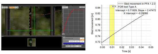 The Photron Fastcam SA 1.1 high-speed camera recordings were processed in terms of the movable sled initial speed with the help of the Photron Fastcam Analyzer program (Figure 11).