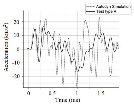 The PCB sensor recorded data plotted against the numerical simulation results are depicted in Figure 12 in terms of sled acceleration for the Type A case.