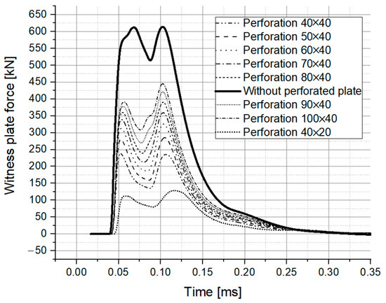 The numerically tested configurations, as mentioned before, were based on an elliptical-shaped perforation. The results of the numerical simulations for all nine scenarios are depicted in Figure 15 in terms of the force acting on the witness plate.