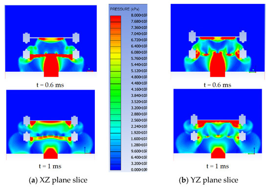 Figure 8 shows the computed shock wave front shape for two different time moments (t = 0.05 ms and t = 0.09 ms) for both simulated scenarios. As can be seen in Figure 8a, the presence of the perforated plate results in a shock wave front disruption. The interaction forms a turbulent and nonstationary flow.